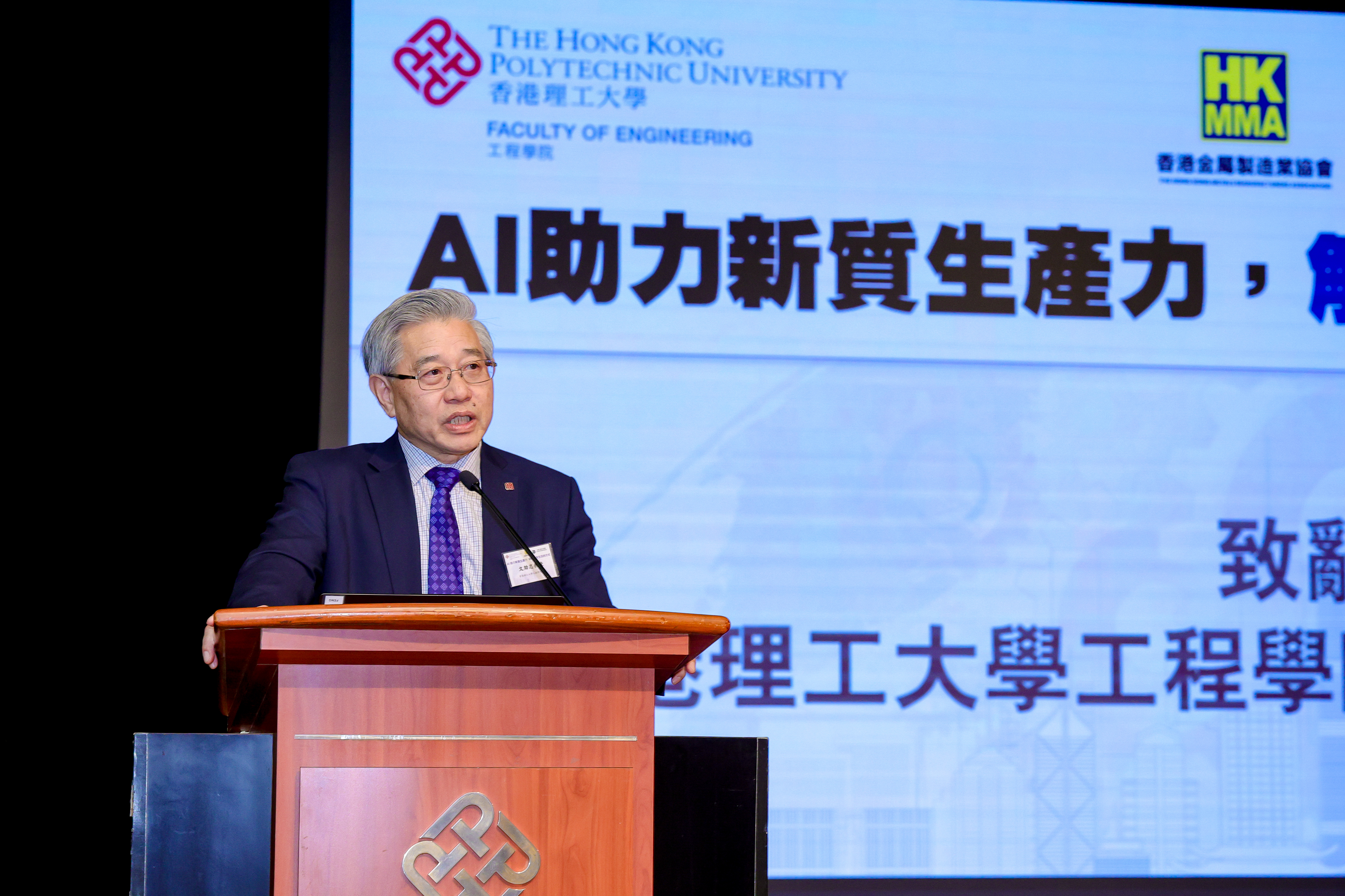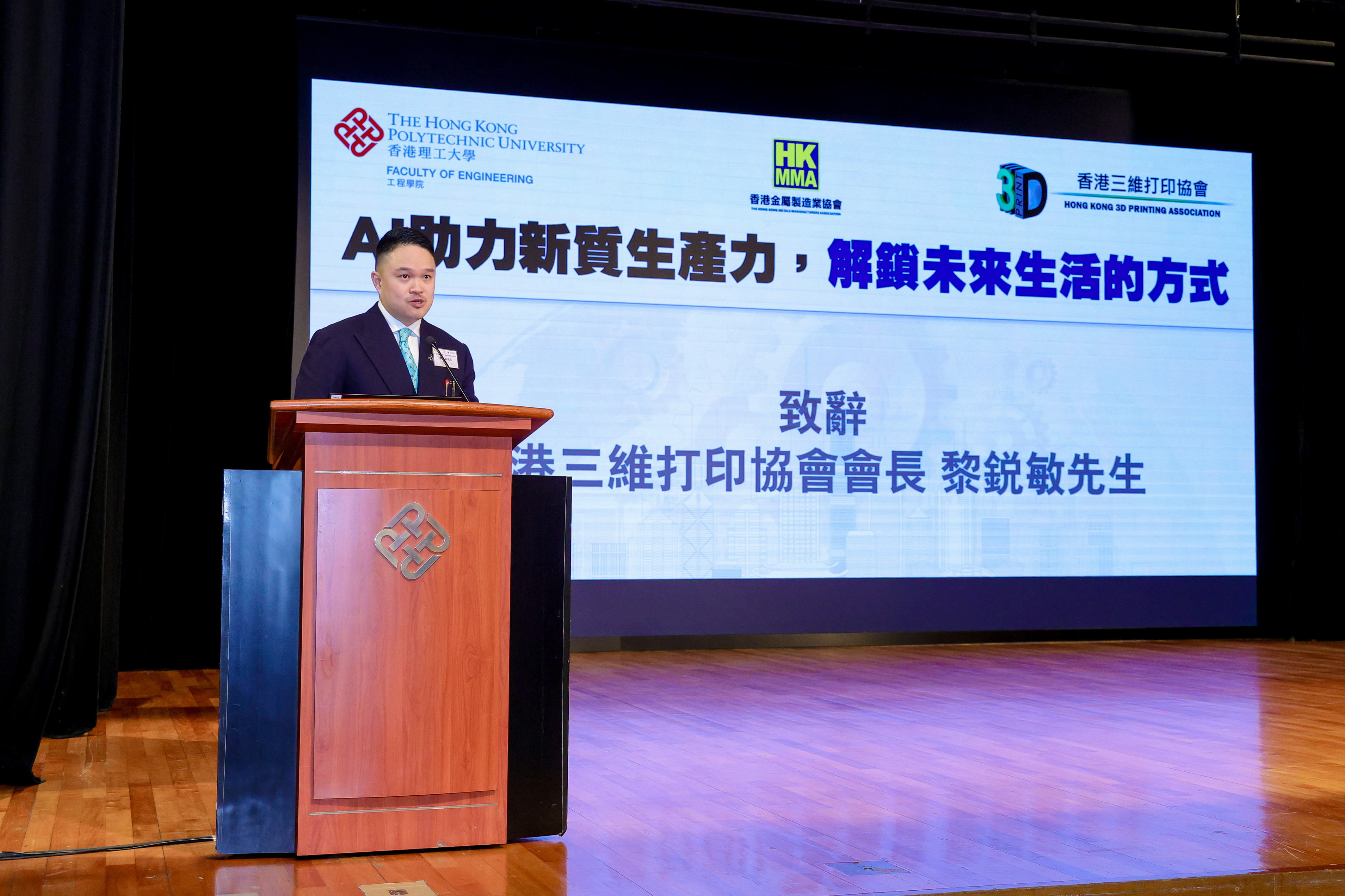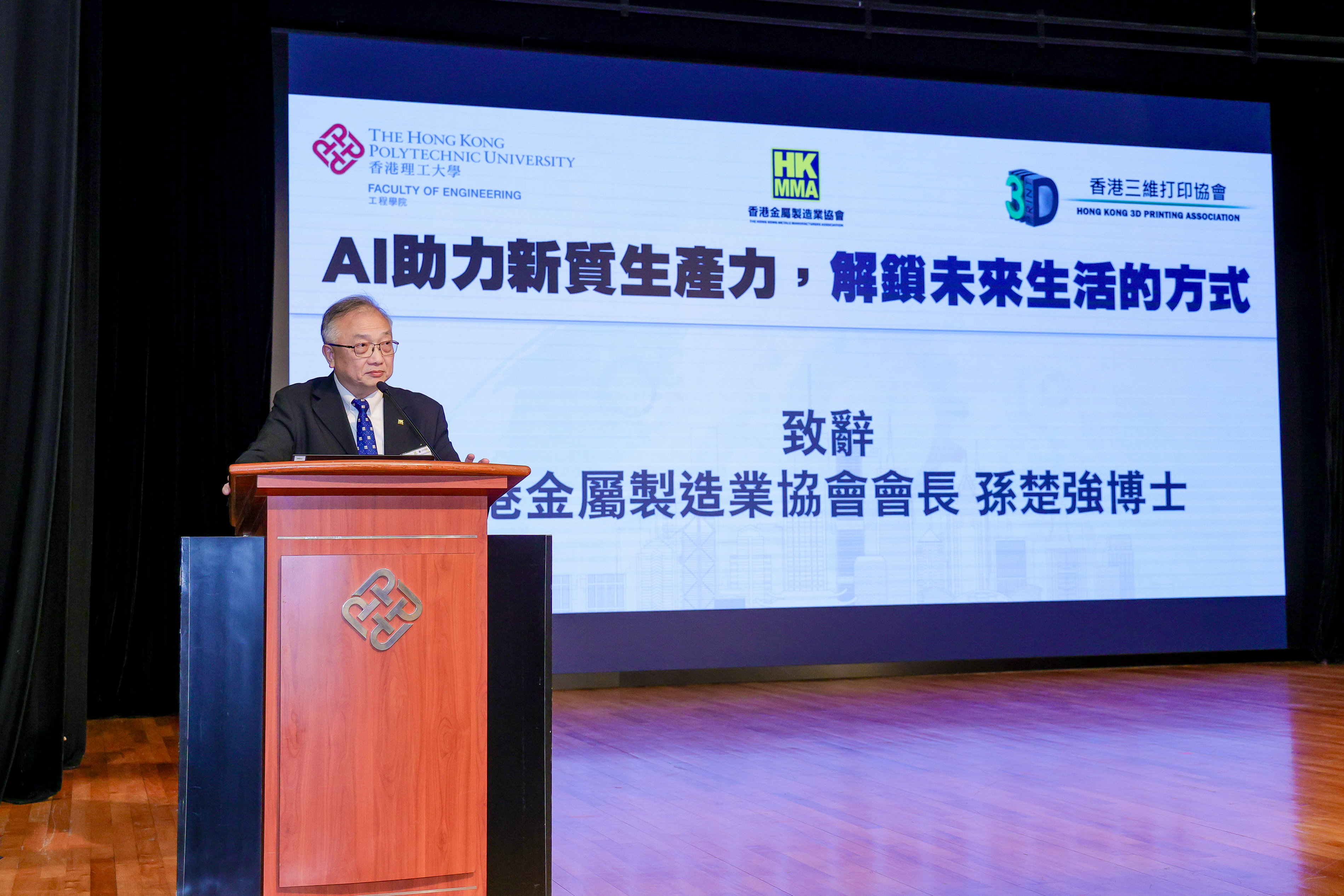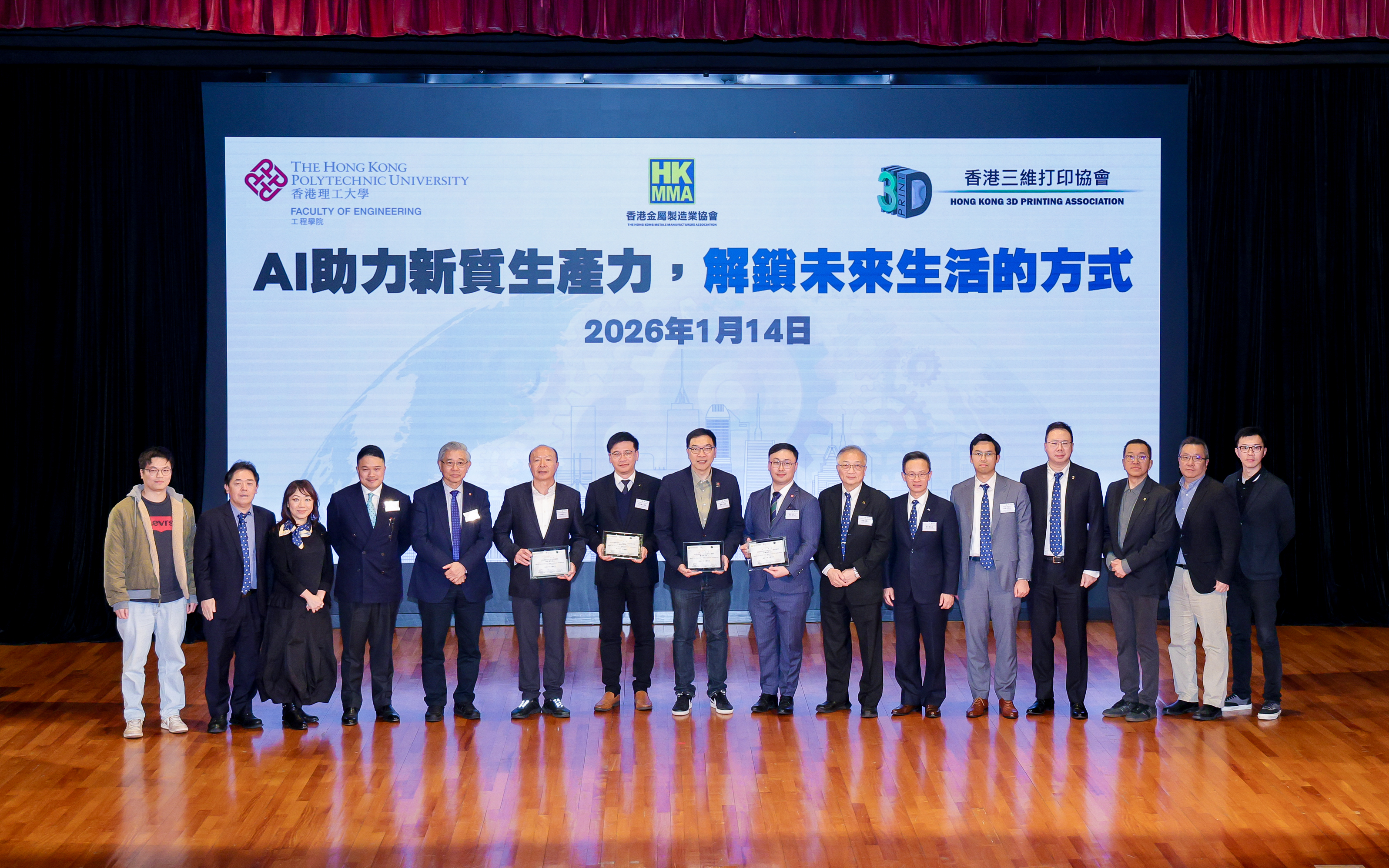 2026 年 1 月 14 日(星期三),由香港金屬製造業協會、香港理工大學工程學院及香港三維打印協會聯合主辦的「AI 助力新質生產力,解鎖未來生活的方式」研討會成功舉行。活動特邀香港金屬製造業協會永遠榮譽會長施金城先生擔任開幕嘉賓並率先致辭,隨後由香港理工大學工程學院院長文效忠教授、香港金屬製造業協會會長孫楚強博士及香港三維打印協會會長黎銳敏先生分別發表致辭,為研討會拉開序幕。